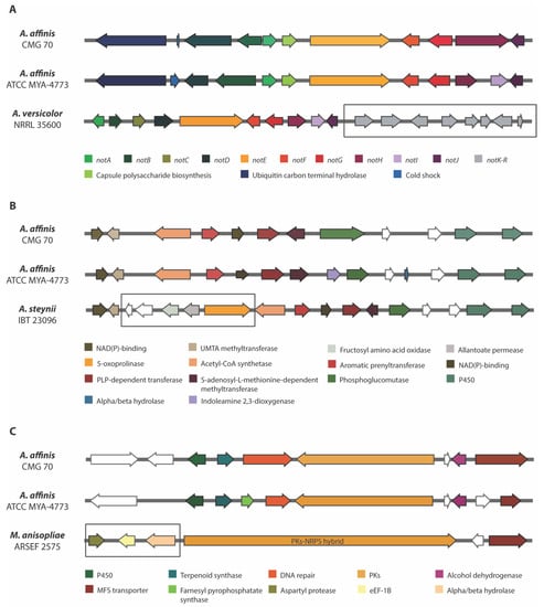 Comparison of three biosynthetic gene regions in Aspergillus affinis strains CMG 70 and ATCC MYA-4773T with: (A) Notoamide BGC of Aspergillus versicolor NRRL 35600; (B) Ochrindole A BGC of Aspergillus steynii IBT 23096; and (C) NG-391 BGC of Metarhizium anisopliae ARSEF 2575. The genes encoding hypothetical proteins are represented as white arrows. The square box shows the missing genes in relation to the A. affinis cluster.