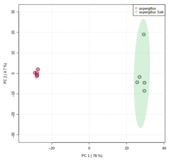 The scores of PCA on all filtered ions clearly revealed dissimilarities in the metabolome of the salted and non-salted extracts of A. affinis (Figure 6). These results show that A. affinis produces different compounds in response to osmotic stress and may adapt to salinity oscillations.