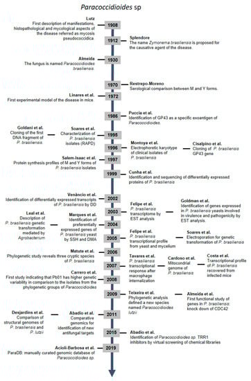 From the first description of the disease in 1908 by Lutz to the present day, a period of more than one century, much progress has been made in understanding the life cycle of this human pathogen. The development of molecular techniques boosted the number of publications related to Paracoccidioides and PCM. Today, more than 2300 published studies can be explored on the Pubmed database (https://pubmed.ncbi.nlm.nih.gov/), which clearly demonstrates the enormous efforts and impressive advance of researchers in understanding this pathogen and its disease. Figure 1 highlights the pioneering studies that paved the way on this long journey. There is still much to clarify and to explore. In this article, we will discuss how all these data accumulated to date can contribute even more to the development of new antifungal strategies to expand the therapeutic range for fighting the disease.