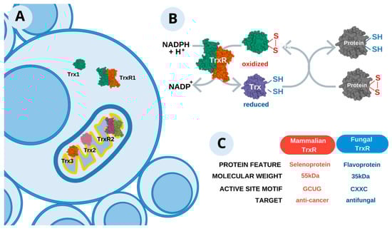 Thioredoxin system, an important means to control oxidative stress. (A) Cyto-localization of the thioredoxin system in Paracoccidioides sp. Three isoforms of thioredoxin were identified, namely Trx1 (cytoplasmatic) and Trx2 and Trx3 (mitochondrial). Thioredoxin reductase (TrxR) also participates in this system, which presents two forms, one in each compartment. (B) Schematic representation of the mechanism of action. The oxi-reduction reaction occurs so that cellular proteins are constantly available to control situations of the reactive species inside the fungus. (C) Comparison from thioredoxin systems between human and fungi.