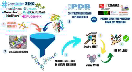 Drug design by in silico approaches. This process can be divided into at least seven steps. (1) Prepare the molecules libraries with filters such as Lipinski’s rule. Currently different databases are commercially available: https://www.molport.com/shop/index; http://www.chemspider.com/; https://zinc.docking.org/; https://www.ebi.ac.uk/chebi/; https://reaxys.emolecules.com/index.php; https://go.drugbank.com/; https://www.ebi.ac.uk/chembl/; https://pubchem.ncbi.nlm.nih.gov/; https://lifechemicals.com; (2) Prepare the target protein, either from the experimentally solved protein database (https://www.rcsb.org/) or by homology modeling (https://salilab.org/modeller/; https://zhanglab.ccmb.med.umich.edu/I-TASSER/; http://www.expasy.org/resources/swiss-model; https://robetta.bakerlab.org/; https://www.schrodinger.com/prime; (3) Analyze the in silico data in search of new molecules (4) Perform the experiments in vitro; (5) Analyze the results in vitro to start point (6) in vivo experiments; (7) Compounds that meet all the requirements can sequence with the hit-to-lead process.