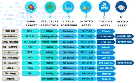 Computational methods have come to play a significant role in drug design. Simulations based on the target structure bring a greater chance of success for drug development in less time [] (Figure 3). The target prediction for drug discovery can be based on structural models available in databases, resulting from X-ray crystallography or NMR spectroscopy []. The best binding sites are identified by computational tools, according to physical-chemical properties, and thus the docking for selection of inhibitors can start by virtual screening []. The number of three-dimensional structures that have been resolved experimentally is growing exponentially, totaling 171,588 structures deposited by November 2020. This situation is not the same for fungi, much less for the genus Paracoccidioides. The Protein Database statistical data (https://www.rcsb.org/stats) indicate that fungal proteins represent about 6% (10,295 structures). Until now, only one structure from Paracoccidioides has been solved by X-ray crystallography, a nucleotidyl-transferase-like antigen, named Pb27 [].