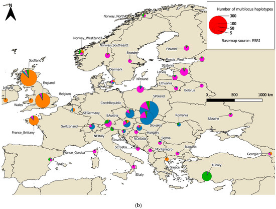 (a) World map of D. septosporum population groups and their STRUCTURE membership at K = 3; (b) European map of D. septosporum population groups and their STRUCTURE membership at K = 5.