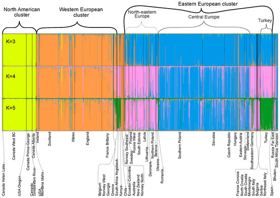 Genotypic diversity measures (H, G, λ; Table 1a) showed the lowest diversity in South Croatia and Spain, while the highest was in Southern Poland and Canada West BC. Genetic diversity measures (Hexp, h, AR; Table 1a), on the other hand, showed the highest diversity in Lithuania, Latvia, and South Estonia while the lowest tended to be in South Croatia or in population groups in the Southern Hemisphere such as Australia and New Zealand. While general trends can be seen from these values, they are influenced by the large variation in sample size between individual population groups; therefore, it is more informative to consider the diversity values for the STRUCTURE clusters (K-3) and subclusters (K = 4 and 5). The Eastern European cluster showed the highest level of diversity by almost all measures, both genotypic and genetic (eMLG, H, G, λ, Hexp, h, AR; Table 1b). The Western European and North American clusters had broadly similar levels of diversity. In terms of subclusters, the Central European subcluster had the highest levels of genotypic diversity (eMLG, H, G, lambda) as well as the highest total number of alleles and private alleles, and Turkey had the lowest values for these measures (Table 1c). However, the Central European subcluster also had the greatest number of samples. When rarefied to an equal number of samples (n = 82), the Northeastern European subcluster had the highest allelic richness (AR), private allele richness (PAR), and mean haploid genetic diversity (h) (Table 1c). Values of Fst varied greatly and ranged between 0 and 1, with larger values between North American and European population groups and Nm (number of migrants) ranging from 0 to infinity (Table S3).