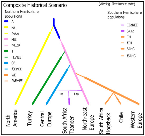 A graphical representation of the overall combined winning historical scenario showing relative timings of cluster and subcluster divergence and colonization events. Founder events and bottlenecks (f in legend) are indicated by thinner lines to indicate a reduction in effective population size. Ra is the rate of admixture and the thickness of lines that indicate the relative contribution from each population. A is the ancestral population, NA the North American cluster, NEE the Northeast European subcluster, T the Turkish subcluster, CE the Central European subcluster, WE the Western European cluster, SATZ the South Africa Tzaneen population group, SAHG the South Africa Hogsback population group, CH the Chile population group.