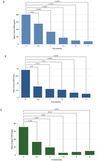 Means of serum β-d-glucan (BDG) (A), serum erythrocyte sedimentation rate (ESR) (B), and serum C-reactive protein (CRP) (C) across different time points.