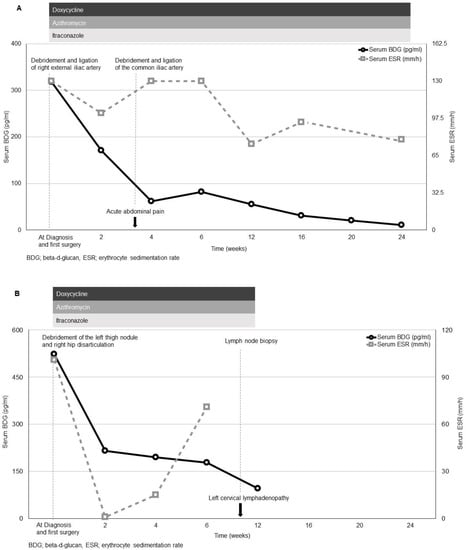 Case 8 with relapsed disease and case 9 with disseminated disease were separately described given their distinct features. In case 8, serum BDG, ESR, and CRP initially declined after the first surgery. However, the patient developed acute abdominal pain and a computed tomography angiography showed thickening wall of the right common iliac artery before the scheduled visit at 1 month. The patient underwent emergent debridement and ligation of the common iliac artery. The pathology did not reveal evidence of fungal disease. The patient’s ESR and CRP were checked at 1 month per study protocol and they were elevated after the surgery. After the second surgery, the patient did well clinically and patient’s serum BDG and CRP normalized at 6 months after diagnosis. However, the patient’s ESR remained elevated throughout the study period (Figure 2A).