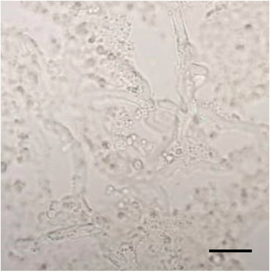 Direct examination of the vascular tissue by using potassium hydroxide preparation showed sparsely septate hyphae (×400; the bar scale is 20 µm).