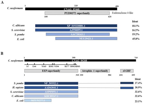 The N-terminal region of the Apn2-like protein contains an Exonuclease–Endonuclease–Phosphatase (EEP) superfamily domain, conserved in all the analyzed species. This large superfamily includes the catalytic domain of a diverse set of proteins, including the ExoIII family of AP endonucleases [48]. In contrast to the Apn2 proteins from other organisms, the putative C. neoformans Apn2 presents an Atrophin-1 domain. Atrophin proteins are conserved transcriptional corepressors involved in nuclear receptor signaling [49]. About 250 amino acid residues, corresponding to the atrophin-1 superfamily domain of Apn2, are missing in the Apn1-like protein (Figure 1A).