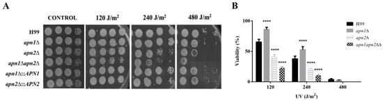 To assess if the CnApn1 and CnApn2 predicted proteins participate in the repair of radiation-derived DNA lesions, WT and mutant strains were exposed to different UV radiation dosages, and the viability of fungal cells was evaluated. Disruption of APN1 and APN2-like sequences resulted in increased susceptibility of C. neoformans to UV radiation (Figure 2). Deletion of both the APN-like genes induced a higher sensitivity to UV radiation when compared to the single mutant strains’ phenotypes (Figure 2A). The susceptibility of the strains to UV radiation was also investigated by plating on YPD agar a defined number of cells after irradiation with 120, 240 and 480 J/m2 at 254 nm. Yeasts’ viability was estimated by CFU counting, and the results indicated that the disruption of APN2 significantly affected the C. neoformans survival in a radiation dose-dependent manner (Figure 2B). Even though moderate resistance to UV radiation was observed for the apn1∆ strain when compared to the WT, the double deletion of APN1 and APN2 promoted an even higher sensitivity to UV radiation than the APN2 single mutation (Figure 2B).