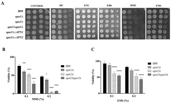 Predicted Apn2 endonuclease is required for yeast viability after exposure to DNA-alkylating agents. (A) The different strains were serially diluted ten-fold and plated onto YPD agar supplemented with DNA damage-inducing agents: 0.03% methyl methane-sulfonate (MMS), 0.04% ethyl methane-sulfonate (EMS), 200 µg/mL N-ethyl-N-nitrosourea (ENU), 20 µg/mL ethidium bromide (EtBr) or 110 mM hydroxyurea (HU). The plates were incubated at 30 °C for 48 h. The results are representative of three independent experiments. (B) Cell viability after exposure to 0.1 or 0.2% MMS or (C) 0.1 or 0.2% EMS. The strains were exposed to the agents in liquid YPD for 1 h, at 30 °C and 150 rpm. Cells were then phosphate-buffer saline- (PBS)-washed and plated on YPD agar for CFU counting. The graphs represent the percentage of viable cells normalized by the percentage of viable control cells. The WT H99 strain was used as control for statistical comparison. One-way ANOVA with Dunnett’s multiple-comparisons test was used to compare the means of results from three independent experiments. Error bars represent standard errors of the mean. **** p < 0.0001; *** p < 0.001; * p < 0.05.