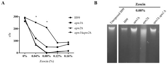 Zeocin is a genotoxic drug that intercalates into the DNA, provoking double-strand breaks [50]. To evaluate the influence of the predicted Apn proteins in the response of C. neoformans to Zeocin, the mutant and WT strains were exposed to different concentrations of the drug, for 1h. The deletion of APN1 and APN2 resulted in increased sensitivity to Zeocin even in low doses (0.04% or 0.08%) (Figure 4A).