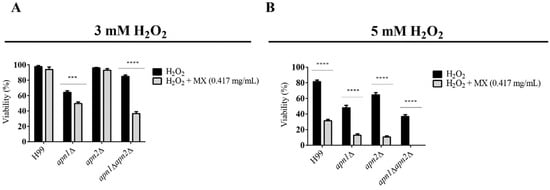 Since MX inhibits the recognition and correction of abasic sites by AP-endonucleases, we investigated the effect of MX exposure in combination with H2O2-induced oxidative stress in WT and APN-like genes’ mutant strains (Figure 5). The strains were exposed to 3 mM or 5 mM H2O2 in combination with 0.417 mg/mL MX, for 1 h, at 30 °C and 150 rpm. Yeasts’ viability was assessed by CFU counting. The exposure to 3 mM H2O2 combined with MX provoked a significant decrease in cell viability for the apn1Δ and the apn1Δapn2Δ mutant strains (Figure 5B), but not apn2Δ. After exposure to 5mM H2O2 and MX, there was a marked reduction of CFU recovery for all the strains.