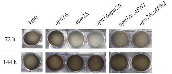 The following are available online at https://www.mdpi.com/2309-608X/7/2/133/s1, Figure S1: Confirmation of knockout mutants by genomic DNA PCR amplification, Figure S2: Temperature and chemical cell stress-related phenotypes of the C. neoformans APN-like genes’ mutants, Figure S3: Growth curve of C. neoformans WT and mutant strains, Figure S4: The apn1∆, apn2∆ and apn1∆apn2∆ mutants are not susceptible to oxidizing agents, Figure S5: The capsule expansion, phospholipase and urease activities were unaffected by the disruption of Apn-like genes, Figure S6: Evaluation of virulence of C. neoformans APN mutants using G. mellonella infection model, Table S1: Primers used in this study and Table S2: Strains used in this study.