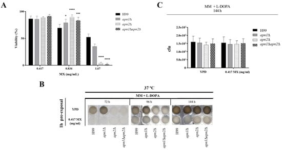 To confirm the role of C. neoformans Apn2 in melanin production, we decided to investigate the effects of MX presence during the induction of melanin synthesis. First, we evaluated possible effects on MX on fungal viability by treating cells of the different strains with 0.417, 0.834 or 1.67 mM of this compound for 1 h at 30 °C. As, at 0.417 mg/mL, this drug was not lethal to either the WT or mutant strains (Figure 7A), this concentration was chosen for the next experiments. The different strains were exposed to 0.417 mg/mL MX, washed and subject to melanin-inducing conditions. The pre-treatment of C. neoformans with MX delayed and reduced the melanization levels of the wild-type strain (Figure 7B), resulting in a phenotype similar to the one observed for the unexposed apn2∆ and apn1∆apn2∆ mutant strains under inducing conditions at 37 °C (Figure 7B). These effects were not associated with cell death, because there was no differences in CFU counts between untreated and treated samples (Figure 7C). Even after 10 days of incubation, the melanization levels of MX-treated wild-type or mutant strains did not increase (data not shown).