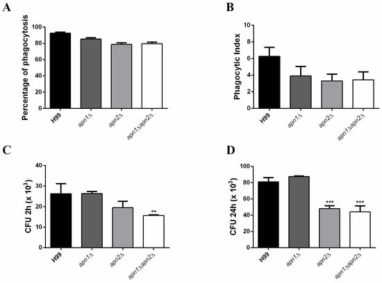 Phagocytes play multiple roles in cryptococcal pathogenesis, and the ability to survive and proliferate inside phagocytes is associated with patient outcome [51]. To access the impact of Apn1 and Apn2 on C. neoformans virulence, we evaluated the in vitro interaction of the mutant strains with macrophages (activated BMDMs) by means of phagocytosis and killing assays. We observed a decrease in the rates of internalization and in the total number of internalized yeast cells from mutant strains in comparison to the WT (Figure 8A,B). In addition, the deletion of the APN2-like gene led to a reduced number of viable C. neoformans cells recovered from the macrophages (Figure 8C,D). Similar results were obtained for the apn1∆apn2∆ double mutant. In contrast, the absence of the APN1-like gene did not change the number of fungal CFUs after the interaction.