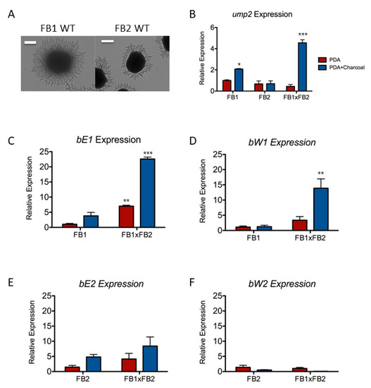 Phenotype of FB1 and FB2 under Low-NH4 conditions. (A) Filamentous phenotype of FB1 and FB2 when grown on PDA media. Scale bars show, for FB1, 100 µM; for FB2, 200 µM. (B) Differential expression of ump2 on PDA vs. PDA supplemented with 1% activated charcoal. FB1 shows upregulation of ump2 on charcoal, as does the FB1xFB2 mated pair, while FB2 has similar levels of ump2 expression on both media. (C) bE1 expression on PDA vs. PDA-charcoal. FB1 expression level of bE1 shows a trend towards significance (p = 0.07) on PDA-charcoal with respect to PDA. bE1 is significantly upregulated in FB1xFB2 on both PDA and PDA-charcoal. (D) bW1 expression on PDA vs. PDA-charcoal. The expression level of bW1 is the same on PDA vs. PDA-charcoal. In the FB1xFB2 mated pair, bW1 expression is significantly increased. (E) bE2 expression on PDA vs. PDA-charcoal. No change in bE2 expression was observed on either type of media, even in the mated pair FB1xFB2. (F) bW2 expression on PDA vs. PDA-charcoal. A similar trend was observed as with bE2, with no difference in expression. For measuring relative levels of expression, the Comparative CT method (threshold cycle number at the cross point between amplification plot and threshold) was used and values were normalized to expression of the constitutively expressed gene, eif2B. Normalization was done using the Pfaffl Method [22]. Changes in gene expression are averages of at least three biological replicates and are displayed as log2-fold changes ± S.D., relative to expression of wild-type FB1 on PDA. Relative expression of each strain and/or condition was compared to the reference strain. All of the analyses were done using a one-way ANOVA with a Dunnett’s multiple comparison post hoc test. (* p < 0.05, ** p < 0.01, and *** p < 0.001).
