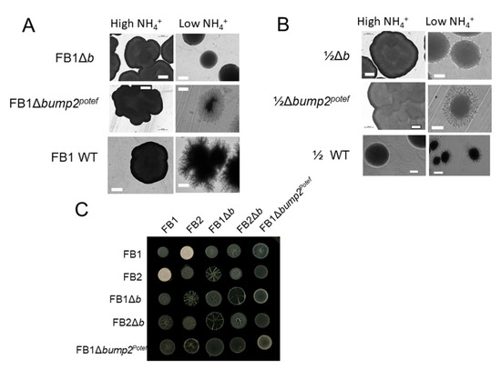 One of the media typically used in this mating assay is Potato Dextrose Agar (PDA) which is by no means nutrient-replete. It is produced from a potato infusion, and though many fungi are able to grow well on this undefined medium, it is lower in nutrients compared to other richer, commonly used media, such as YEPS or complete medium [13]. In order to take into consideration the nutrient limitation already posed by the PDA, we used haploid strains grown on PDA without charcoal as a baseline for comparison. Both FB1 and FB2 strains showed a similar phenotype on low-ammonium media, including PDA, formation of narrow hyphae that extended out onto the surrounding media (Figure 1A). However, they did not respond with the same differential gene expression. On AM Low-NH4 medium, FB1 shows a dramatic increase in ump2 expression as compared with the same strain on AM High NH4 ([11]; also, see Supplementary Materials, Figure S1). While FB1 increased ump2 expression on PDA-charcoal (p < 0.0.05), the magnitude of this increase was far less than what was observed comparing expression on AM Low NH4 with AM High NH4 [11], suggesting that the difference in available ammonium concentrations was not as great in PDA vs. PDA-charcoal. Moreover, the expression level remained unchanged for FB2 on media containing charcoal as compared to PDA alone. Of note, the mated pair also showed increased ump2 expression as compared to the same mixture of both strains on PDA without charcoal (p < 0.001) (Figure 1B). As there was no significant difference in the expression of ump2 in FB2 relative to the expression of this ammonium transceptor in FB1 when both haploid strains were grown on PDA alone, the upregulation of the mated pair on PDA-charcoal was not simply the additive effect of the two haploids. In addition to the mating loci, FB1 and FB2 are not isogenic, but they are congenic [24]. As the morphological response of both FB1 and FB2 was the same under Low-NH4 conditions and the deletion of ump2 interrupts this response, it was striking that the change in ump2 transcript level on PDA to the relatively lower ammonium condition (i.e., plus charcoal) was not the same in both strains.