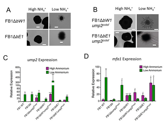 Before we limited our investigations to haploid strains alone, we further analyzed the contribution of different alleles of the b mating type locus during mating-inducing conditions. As described above for our examination of ump2 expression level, these comparisons were also done by examining each haploid strain on PDA as compared to PDA supplemented with 1% activated charcoal. The level of expression from each allele was also compared to expression when compatible haploid strains were mixed together. The two products of the FB1 locus, bE1 and bW1, were both upregulated in the mated pair when plated on charcoal PDA (p < 0.01) (Figure 1C,D), while neither of the products of the FB2 locus, bE2 or bW2, showed any significant variation in expression level across the strains and conditions examined (Figure 1E,F). Again, the magnitude of increases in expression from High- to Low-NH4 conditions was substantially lower for both bE1 and bW1, as compared to FB1 grown on AM medium ([10]; Supplementary Materials, Figure S1). As the genes of the b1 mating type locus, bE1 and bW1, seem to be expressed differentially to a greater extent than the homologous components of the b2 mating type locus, we chose to focus on the FB1 strain to better understand the relationship between Low-NH4 response and mating type locus.
