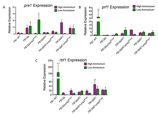 Our previous investigation of the interplay between ump2 expression, b mating loci expression, and haploid phenotypes had led to the discovery that alteration in the expression levels of these two regulators could have downstream effects on the expression levels of other targets that previously have been considered functional only during mating, including mfa1. The protein product of the mfa1 gene is a pheromone precursor [27]. In FB1 WT, under Low-NH4 conditions, mfa1 expression increases, producing more pheromone, potentially as a way of increasing the likelihood of attracting a compatible mating partner. This finding was confirmed for both mfa1 and mfa2, for strains 1/2 and 2/9, respectively (Supplementary Materials, Figure S3). In the canonical mating pathway, the interaction of pheromone with pheromone receptor results in a cascade of events leading to the phosphorylation of Prf1 [9]. The Prf1 transcription factor, when appropriately phosphorylated, increases expression of the bE and bW genes [9]. However, in the haploid, it appears that the presence of an intact b mating type locus is required for normal mfa1 expression. Under High-NH4 conditions, complete deletion of the b locus had little effect on the expression level of mfa1; however, in both bW1 and bE1 mutants, mfa1 expression was elevated even in these replete conditions. Under Low-NH4 conditions, a sharp upregulation of mfa1 was observed in the wild type FB1. Neither partial b mutant nor the FB1 complete b deletion mutant showed a dramatic change in mfa1 expression on nutrient-depleted media, having levels approximately the same as the respective strain on High-NH4 media (Figure 3D). However, the bW1 deletion strain did show a significant increase in mfa1 expression on Low-NH4 medium, compared with FB1 wild type on nutrient-replete medium (Figure 3D). Interestingly, constitutive ectopic expression of ump2 increased mfa1 expression in the complete b deletion mutant and in the partial bE1 deletion mutant (but not for FB1ΔbW1), suggesting that bE1 and bW1 have different and non-redundant roles in the haploid cell (Figure 3D). Expression level of mfa1 alone was not sufficient to account for filamentous phenotype, as the bE1 mutant overexpressing ump2 showed elevated levels of mfa1 on High-NH4 media but failed to filament (Figure 3B,D). Other traditionally mating-related targets were investigated in the FB1 background, such as expression of the pra1 gene, encoding the pheromone receptor, prf1, the gene for the mating transcription factor, and rbf1, the gene for the master regulator of b heterodimer response, to determine if expression of these targets also changed with different levels of ump2 expression and different components of the b mating type locus intact. For wild type FB1, prf1 and rbf1 expression each increased significantly on Low NH4 (results that were reproduced in the 1/2 strain; see Supplementary Materials, Figure S3). Deletion of the entire b locus, was associated with substantial increase in pra1 expression (Figure 4A). However, either complete or partial deletion of the b mating type locus resulted in decreased expression of prf1 and rbf1 under Low-NH4 conditions. The only other notable changes were a significant (p < 0.05) increase of pra1 expression in the bE1 deletion mutant on High NH4 and on both High- and Low-NH4 in this mutant when simultaneously overexpressing ump2; additionally, the bE1 deletion mutant had a significant (p < 0.01) increase in rbf1 expression on High NH4. (Figure 4).