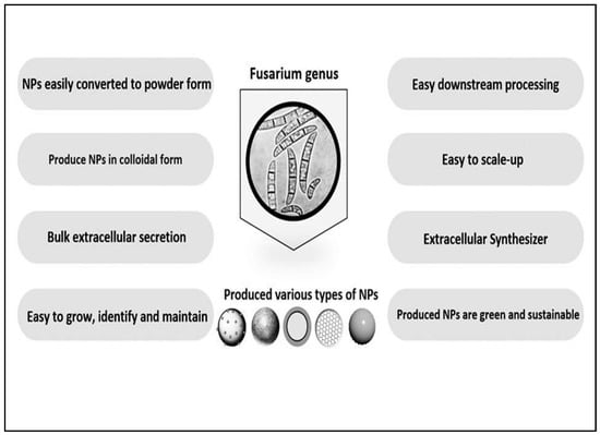 Fungi play a very important role in solving major global problems for sustainable development as compared to other biological systems. They enhance resource efficiency, converting waste to valuable food and feed ingredients, making crop plants more robust to survive in climate change conditions, and functioning as host organisms for the production of new biological drugs [25]. Fungi are the most promising hotspots for finding new drug candidates, metabolites, and antimicrobials [8]. They are also responsible for the shift from chemical processes to biological processing, achieved by fungal enzymes instead of chemical processes in industries, such as textiles, leather, paper, and pulp, which have significantly helped to make the process eco-friendly by reducing the negative impact on the environment [16,26]. The fungal system has been found to be a versatile biological system with the ability to synthesize metal nanoparticles intracellularly as well as extracellularly. Moreover, they are preferred over other biological systems because of their ubiquitous distribution in nature, and therefore, many fungi have been explored for the production of various metal nanoparticles of different shapes and size. Out of diverse fungal genera used for the synthesis of nanoparticles, the genus Fusarium has been the choice of many investigators [13,16]. The advantages of using Fusarium spp. for the synthesis of nanoparticles are enlisted in Figure 1.