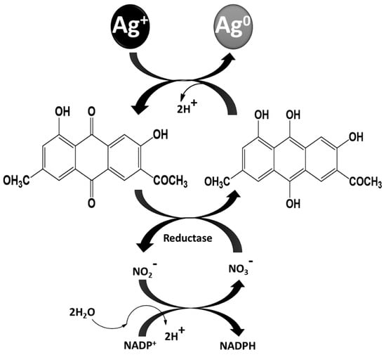 In addition, Duran et al. [68] and Kumar et al. [69] proposed almost similar mechanisms for the biosynthesis of AgNPs from F. oxysporum. In the former study, the authors reported the role of anthraquinone and the NADPH-nitrate reductase in the biosynthesis of AgNPs, and it was hypothesized that the electron required to fulfill the deficiency of aqueous silver ions (Ag+) and convert it into Ag neutral (Ag0 i.e., AgNPs) was donated by both quinone and NADPH. However, in the later study, it was demonstrated that the reduction of NADPH to NADP+ and the hydroxyquinoline possibly acts as an electron shuttle transferring the electron generated during the reduction of nitrate to Ag+ ions, converting them to Ag0 (Figure 4).
