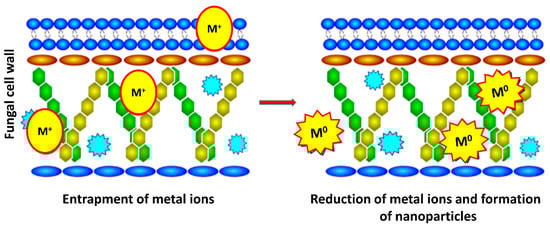 There are reports suggesting various hydroquinones to act as electron shuttles reducing the metal ions. F. oxysporum f. sp. cubense JT1 demonstrated to have the capacity to reduce the gold ions to AuNPs [48]. Moreover, as per Ahmad et al. [16], the capacity of reducing metal ions is species-specific. The reductase specific to F. oxysporum and F. moniliforme were not able to synthesize AgNPs intracellularly and extracellularly. In addition to extracellular mechanisms, there are few mechanisms proposed for intracellular mycosynthesis of metal nanoparticles. In the case of Fusarium-mediated intracellular mycosynthesis, metal nanoparticles usually formed below the cell surface and this may be due to the reduction of metal ions by metabolites (i.e., enzyme) present in the cell membrane. Generally, a two-step mechanism has been proposed for intracellular mycosynthesis of nanoparticles. In the first step, aqueous metal ions are attached to the fungal cell surface by the electrostatic interaction between lysine residues and metal ions (M+). However, in the second step, the actual mycosynthesis of nanoparticles occurs by the enzymatic reduction of metal ions (M0), which leads to the aggregation and formation of nanoparticles [49] (Figure 5).
