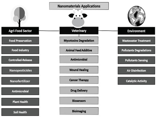 Figure 7. Applications of Nanotechnology in agri-food, veterinary medicine, and environment.