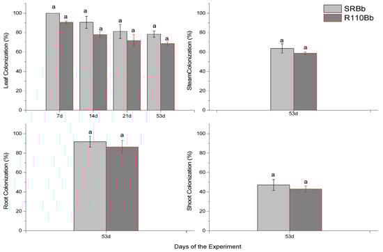 - Renuka, S.; Ramanujam, B.; Poornesha, B. Endophytic Ability of Different Isolates of Entomopathogenic Fungi Beauveria bassiana (Balsamo) Vuillemin in Stem and Leaf Tissues of Maize (Zea mays L.). Indian J. Microbiol. 2016, 56, 126–133. [Google Scholar] [CrossRef]