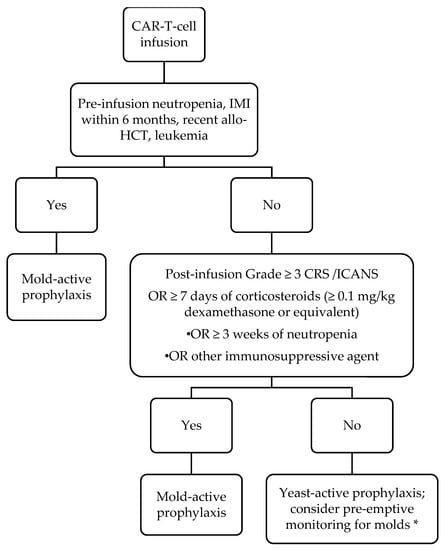 - E Lewis, R.; Kontoyiannis, D.P. Chimeric Antigen Receptor T-cell Immunotherapy and Need for Prophylaxis for Invasive Mold Infections. Clin. Infect. Dis. 2020, 71, 1802–1803. [Google Scholar] [CrossRef]