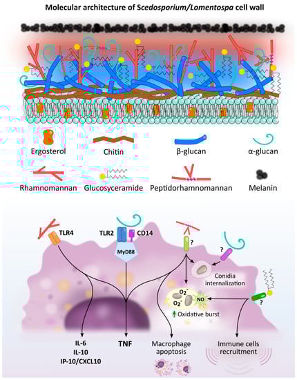 Scedosporium/Lomentospora cell wall components induced macrophage activation and Pattern Recognition Receptors (PRR) involved in these interactions. Rhamnomannans binds to TLR4 stimulating TNF, IL-6, IL-10 and IP-10/CXCL10 release. α-glucans stimulates TNF release through TLR2, CD14 and MyD88. It is also involved in conidia uptake, but the receptor involved in this process is unknown. Peptidorhamnomannan (PRM) is involved in fungal phagocytosis, induces macrophages death, and stimulates production of TNF, nitric oxide (NO) and superoxide (O2−). Glucosylceramide (GlcCer) induces NO and superoxide O2− production, increases fungal conidia killing, and promotes the recruitment of immune cells, including macrophages. The GlcCer and PRM receptor/s implicated in this activation have not been elucidated.
