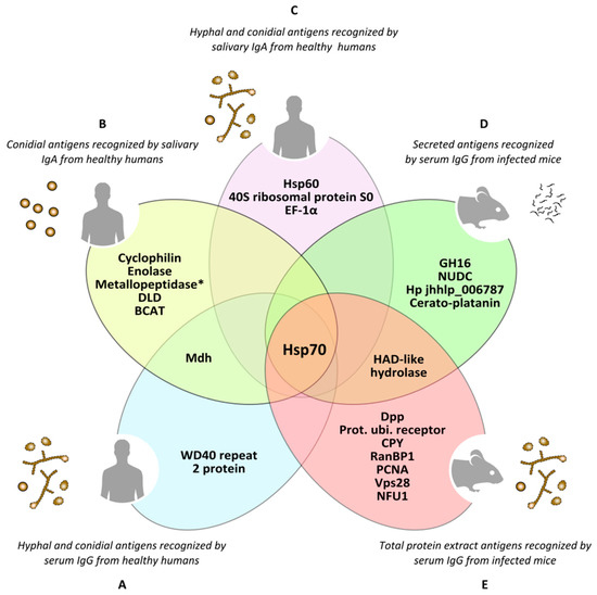 Antigens of Lomentospora prolificans identified in several immunoproteomics-based studies. Antigens detected as being reactive against at least 70% of human serum samples in both hyphal and conidia morphologies (A). Conidial antigens that reacted with at least 50% of human salivary samples (B). The most immunodominant antigens that react with human salivary samples, detected in both fungal morphologies (C). The most immunodominant antigens of secretome (D) and total protein extract (E) recognized by sera from infected mice. Mdh: malate dehydrogenase; Hsp70: heat shock protein 70; Metallopeptidase: Cys-Gly metallo-dipeptidase DUG1; DLD: dihydro-lipoyl dehydrogenase; BCAT: putative branched-chain-amino-acid aminotransferase TOXF; Hsp60: heat shock protein 60; EF-1α: translation elongation factor-1 α; GH16: glycosyl hydrolase family 16 protein; NUDC: nuclear movement protein nudC; Hp jhhlp_006787: protein with unknown function Hp jhhlp_006787; HAD-like hydrolase: halo-acid dehalogenase-like hydrolase; Dpp: dipeptidyl-peptidase; Prot. ubi. receptor: Proteasomal ubiquitin receptor; CPY: carboxypeptidase Y; RanBP1: RanBP1 domain-containing protein; PCNA: proliferating cell nuclear antigen; Vps28: vacuolar protein sorting-associated protein 28; NFU1: NFU1 iron-sulfur cluster scaffold-like protein. * This antigen has been added by repeating the peptides spectra analysis with a later version of the NCBI (National Center for Biotechnology Information) database.