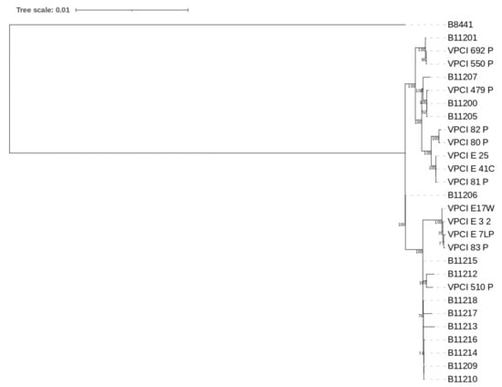 2.2.4. Genome Sequencing, SNP Calling, and Phylogenetic Analysis
