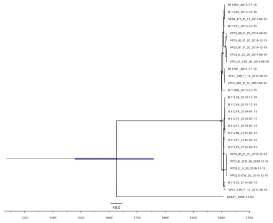 To investigate the transmission patterns of C. auris strains colonizing patients and their respective environment, we derived the divergence times of the isolated strains and other Indian C. auris isolates from the same clade I based on the base substitution and divergence time framework reported previously []. According to the phylogeny, the most recent common ancestor for the clade I Indian strains dates back to the year 1626 (95% highest posterior density, 260.3–539.8 years ago). Consistent with the results of phylogenetic analysis, nine isolates of this study also grouped into two clusters according to their time of emergence (Figure 2). Cluster 1 had four isolates, one from ear of patient D (VPCI/83/P/2020), and three environmental isolates (VPCI/E/7LP/2020, VPCI/E/17W/2020 and VPCI/E/3/2020) from the vicinity of the same patient. The most recent common ancestor among these four isolates was estimated to have emerged in 2018 (95% HPD, 0.5–1.7 years ago). Cluster 2 included isolates from patients B, C, D along with environment isolates, VPCI/E/25/2020 (bed railing, patient B) and VPCI/E/41C/2020 (bed railing, patient I), and this cluster was estimated to have emerged about five years ago (95% HPD, 4.2–7.4 years ago). All the nine isolates were submitted to GenBank under accession number SAMN17149510-18.