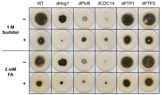 The addition of sorbitol to the CM media resulted in longer hyphae compared to CM alone (Figure 5, top panel). From visual inspection, we noted that the hyphae tended to branch to a lesser degree and were generally more invasive, i.e., they grew deeper into the agar (Figure 5, top panel). Although the dHog1 mutants barely grew in the presence of sorbitol, high osmolarity did not promote invasive growth, and the hyphal pattern was essentially normal, with the production of aerial hyphae (Figure 5). The dPtcB mutants showed an altered, disoriented hyphal pattern, and in the presence of sorbitol, the dPtcB mycelia were highly tumbled, with short branches. The dCDC14 hyphae were tumbled and the colony was less dense, yet it seems that high osmolarity encouraged hyphal branching, even in comparison to the WT. In Figure 5, the minus-FA controls show a slightly different morphology from the minus-sorbitol controls. These differences can be attributed to the presence of DMSO, the solvent for FA. Thus, DMSO caused the hyphae to grow in less density and in disorder, although the radial growth rate was not strongly affected (see Figure 6). The addition of ferulic acid (FA) to the CM media led to increased hyphal density, but with almost normal growth patterns (Figure 5, bottom panel). The dHog1 hyphae were shorter in comparison to the WT. The dCDC14 on DMSO grew as on the CM without DMSO, but again, in the presence of FA, the hyphal growth pattern was similar to the WT (Figure 5) despite the slow growth of dCDC14 (Figure 6). When coping with FA, the colony tends to be denser. The reduction of the linear growth could reflect the ability of the fungus to cope with stress. Both dPTP1 and dPTP2 behave as the wild-type when exposed to either sorbitol or FA.