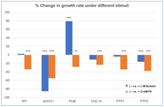 Comparison of FA and sorbitol’s effects on the different strains. The data from Figure 6 are replotted as ratios. CM agar plates with or without sorbitol (− or + 1 M sorbitol) or CM with 0.15% v/v DMSO with or without FA (− or + 2 mM FA) were compared. The t-test p-values are marked as follows: p-value < 0.05—**; p-value < 0.01—***.