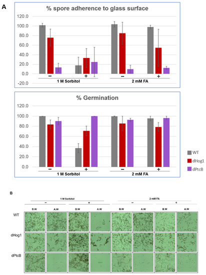 The linear radial growth of the WT and mutants is shown in Figure 6 (here and in the following figures, the bar graphs follow a color code identifying each strain). The data are replotted as ratios to show the relative effects of sorbitol and FA (Figure 7). It should be noted that, in some cases, the colony perimeter is not easily visible in Figure 5 due to invasive hyphae; the colony perimeters were marked for measurement at the maximum radius of the colony including invasive hyphae within the agar medium. As can be seen from Figure 6 and Figure 7, along with Figure 4, although DMSO is known to affect cell membranes [31], at the low concentration (0.15%) used to apply the FA, it did not affect the radial growth rate of any of the strains tested. Moreover, in the absence of functioning Hog1, high osmolarity strongly decreased the growth rate, as expected [32]. In the presence of FA, the WT growth rate decreases (Figure 7). On the other hand, it was interesting to see that in the WT, spore morphology, attachment, and germination were highly impaired in the presence of high osmolarity, but very much less affected by the presence of FA. Additionally, as expected, dHog1 had difficulty growing at a high osmolarity. Relative to WT, dHog1 grew better in the presence of FA than at a high osmolarity, suggesting different pathways for high osmolarity and FA responses, though both affect Hog1’s dual phosphorylation. The variability in spore germination and attachment was high (Figure 8A), but the general trend may indicate, again, better attachment and germination in the presence of FA than sorbitol. The dPtcB and dCDC14 mutants showed a slower growth rate compared to the WT. Strikingly, dPtcB grew better on CM+sorbitol than on CM. Thus, dPtcB had a relatively better ability to cope with high osmolarity than with the presence of FA (Figure 4B and Figure 6). In this sense, dHog1 and dPtcB have opposite stress sensitivities (Figure 7). The attachment and germination of dPtcB conidia were highly variable and generally impaired (Figure 8). The impaired germination is in agreement with the data for the PtcB ortholog of A. fumigatus [1]. The germination and attachment rates could not be measured for CDC14 due its low spore count; however, as noted above, the few spores formed were able to germinate. The deletion of PTP1 did not affect the growth rate, in accordance with previous reports [27]. dPTP2 showed a trend toward a slightly increased growth rate on all media except for CM+sorbitol; the difference was significant only in the presence of FA (Figure 6).