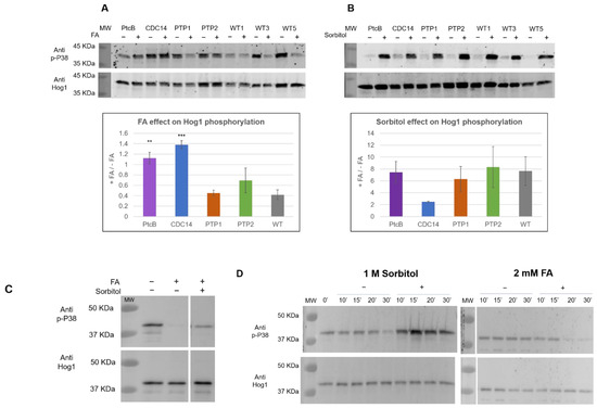 In order to explore the involvement of these genes in the Hog1 phosphorylation levels in response to FA, the mutants and WT were given a brief exposure to FA. The phosphorylation was assayed using immunoblots with an antibody to dual-phosphorylated mammalian P38 (anti p-P38), which has been used extensively to detect dual-phophosphorylated Hog1 (pHog1) in fungi (for example, [33,34]). An antibody against yeast Hog1 (anti Hog1) was used to quantify the total Hog1 protein levels. In the WT, the addition of FA resulted in decreased ppHog1 levels (Figure 10A). This was not the case, however, for two of the mutants; in the strains deleted for PtcB or CDC14, there was little or no reduction in the ppHog1 levels upon exposure to FA (Figure 10A). The addition of sorbitol to the CM media rapidly increased the ppHog1 levels, in the WT and in all four mutants (Figure 10B). Two points emerge from these data: first, the modulation of Hog1 dual phosphorylation by FA and sorbitol are not only opposite (Figure 10A,B) but are also genetically separable, because the loss of PtcB or CDC14 affects the response to FA but not to high osmolarity (sorbitol). The second point is that two distinct phosphatases belonging to different classes are both required for dephosphorylation in response to FA (Figure 10A). This suggests multiple modulators for Hog1, but because each phosphatase mutant showed different properties, the question of the mechanism of Hog1 dephosphorylation upon exposure to FA arises. Next, we tested the effect of sequentially adding FA and sorbitol to the CM media. As shown in Figure 10C, the addition of sorbitol partially counteracted the decrease in the phosphorylation levels due to FA exposure.