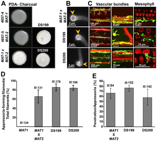 - Hu, G.G.; Linning, R.; Bakkeren, G. Sporidial mating and infection process of the smut fungus, Ustilago hordei, in susceptible barley. Can. J. Bot. 2002, 80, 1103–1114. [Google Scholar] [CrossRef]
