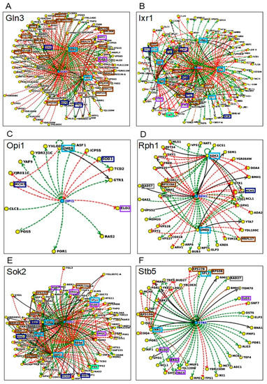 Based on the documented interactions (DNA binding evidences or DNA expression data) deposited in the Yeastract database [38], the complex regulatory networks describing the interactions between the main TFs found to be specifically required for methanol tolerance (Gln3, Ixr1, Opi1, Rph1, Sok2, Stb5) and their target genes in the methanol dataset is shown in Figure 6A–F, respectively. These methanol-specific TFs control a considerable number of the genes with strong phenotype that participate in methanol enriched biological functions discussed previously, such as DNA repair (e.g., MET18, RAD27, RAD5, RAD51, RAD54, RAD57), cell wall biosynthesis (e.g., FKS1 and SMI1), membrane biosynthesis (e.g., ELO2, ELO3, ERG2, ERG3, ROT2), oxidative-stress responsive genes (e.g., FEN2, GSH1, MCH5, PRX1, SOD1) and protein synthesis (e.g., MRPL, MRPS, RPL, and RPS) families of genes. The transcriptional network controlled by the TF Ixr1, that regulates hypoxic genes during normoxia, is highly complex since it controls, the highest number of genes (6) encoding other transcription factors of the methanol dataset: Gln3, Opi1, Rph1, Sok2, Stb5, and Ume6 [42,43,44,45]. Ngg1 was not included in this analysis due to the low number of regulatory interactions available at Yeastract database. The regulatory interaction networks for the TFs that are shared between methanol and ethanol datasets, Sfl1 and Ume6, with the genes that confer methanol tolerance are presented in Figure 6, panels G and H, respectively. The regulatory networks for Cbf1, Rpn4, and Sfp1 are not shown because, due to the high density of the regulated methanol tolerance genes, they do not provide useful information.