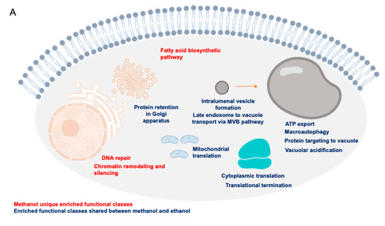 Methanol tolerance determinants involved in protein synthesis, through cytoplasmic and mitochondrial translation, include a large number of genes encoding (i) proteins of the large subunits of ribosomes—Ribosomal Proteins of the Large subunit, RPL genes (e.g., RPL8A, RPL2B, RPL34B, RPL14A, RPL31B, RPL20A, RPL36B); (ii) proteins of the small subunit of ribosomes, Ribosomal Proteins of the Small subunit, RPS genes (e.g., RPS17A, RPS19A) (Supplementary Material, Table S1).