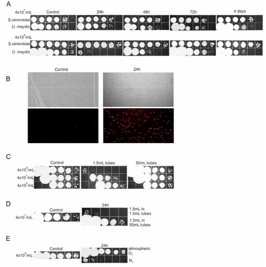 Viability of S. cerevisiae and U. maydis cells upon water transfer. (A) One milliliter of cell suspensions of 4 × 107 cells/mL (upper panels) and 4 × 108 cells/mL (lower panels) were incubated in water in 1.5 mL tubes for 4 days. Aliquots were withdrawn at one day intervals, used for preparation of 10-fold serial dilutions, and spotted on the solid rich medium. (B) Brightfield and fluorescent imaging of cells stained with propidium iodide (PI). Water-transferred early-stationary phase cells (4 × 108 cells/mL) were stained with PI before (Control, left micrographs) and after 24 h of incubation (right micrographs) for detection of damaged/dead cells. Fluorescence micrograph of 24-h-incubated cells clearly showed that nearly all cells were fluorescing red, indicating membrane damage. (C) One milliliter of U. maydis cell suspensions (4 × 108/mL, 4 × 107/mL, and 4 × 106/mL) were incubated in water in 1.5 mL tubes and 50 mL tubes for 24 h. Ten-fold serial dilutions were spotted on the solid growth medium. (D) One-and-a-half milliliter of U. maydis cell suspensions (4 × 107/mL) were incubated in water for 24 h in 1.5 mL tubes and 50 mL tubes; 10-fold serial dilutions were spotted on the solid growth medium. (E) One milliliter of 4 × 108 U. maydis cell suspensions were incubated in water in 50 mL tubes for 24 h, under atmospheric air (O2) or under N2 atmosphere. Ten-fold serial dilutions were spotted on the solid growth medium. Left panels represent the starting number of cells in suspensions (Control). All experiments were performed at least three times and the representative results are shown.