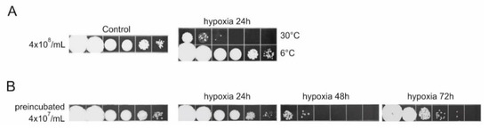 Oxygen-consuming metabolism affects cell survival under limited oxygen. (A) One milliliter of 4 × 108 dense cell suspensions were incubated in water in 1.5 mL tubes at 6 °C or 30 °C, for 24 h; 10-fold serial dilutions were spotted on the solid growth medium. (B) Stationary cell culture, washed and brought to a density of 4 × 107/mL was incubated in water for 24 h, prior to concentrating to a density of 4 × 108/mL. One milliliter aliquots of high-density suspension were distributed in three 1.5 mL tubes and further incubated under limited aeration for 24 h, 48 h, or 72 h. At each time-point, suspension from a single tube was used for preparation of dilutions and were spotted on the solid medium. All experiments were performed at least three times and the representative results are shown.