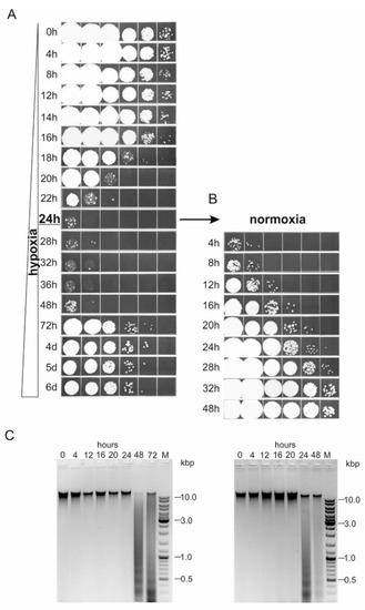 Survival kinetic of U. maydis high-density cell suspension during incubation in water under hypoxic and normoxic conditions. (A) 4 × 108 cells/mL were incubated in water in 1.5 mL tightly sealed tubes, for induction of hypoxia. At the indicated time-points, a single tube was taken for preparation of 10-fold serial dilutions and spotted on the solid growth medium. (B) Cell suspension incubated in 1.5 mL tube for 24 h was further incubated in water in a 50-mL tube (normoxia) and dilutions were spotted at indicated time-points for monitoring of the recovery. (C) Agarose gel electrophoresis of genomic DNA extracted from cell suspensions incubated in water for the indicated time intervals under hypoxic (left) and normoxic conditions (right). M- GeneRuler DNA Ladder Mix, Thermo Scientific.