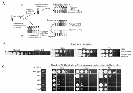 Restitution of viability under aeration of cells that died during incubation in water, in 1.5 mL tubes (24 h hypoxia). (A) Schematic diagram of the experimental design. The increase of cell viability was monitored at 1-day intervals in (i) the original suspensions of the cells incubated in water at 30 °C, under continuous agitation, before preparation of serial dilution and plating, or in (ii) pre-prepared 10-fold serial dilutions, following incubation under the same conditions. (B) Initial wild-type cell suspension (died upon 24 h-incubation under limited aeration) and its serial dilutions (pre-prepared dilutions) were incubated in water in 50-mL tubes under aeration, at 30 °C for 3 days, and spotted on the solid growth medium in one-day intervals. (C) Comparison of restitution of viability under aeration of wild-type and RUS mutants in supernatants derived from 24-h-incubated high cell density suspension of wt cells, under limited aeration (SH-supernatant). Wild-type cells (4 × 108/mL) were incubated in water in 1.5 mL tubes (hypoxic conditions). After 24 h, cell suspensions were centrifuged and Millipore filtrated supernatants were inoculated with 8 × 103 wild-type cells or RUS mutants, and incubated for the next 72 h under aeration (50 mL tubes). At one day intervals, aliquots were withdrawn, 10-fold serial dilutions were prepared and spotted on the solid medium. The panels are representatives of three independent experiments.