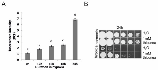 Production of ROS induce cell death under limited aeration. (A) ROS generation determined by measurement of DCF fluorescence. U. maydis cell suspensions (4 × 108/mL) were incubated in water in 1.5 mL tightly sealed tubes for 12 h, 16 h, 18 h, and 24 h. For each time-point, a separate tube was designated. Error bars indicate standard deviations of four independent measurements. Significant differences (p < 0.05) between control cells and cells in hypoxia are depicted by different letters. (B) Survival of U. maydis high-dense cell suspension (4 × 108/mL) incubated for 24 h in water and in the presence of 1 mM thiourea. Normoxia depicted incubation in loosely capped 50 mL tubes, and hypoxia in 1.5 mL tubes; 10-fold serial dilutions were spotted on the solid growth medium. Experiment was performed three times and the representative result is shown.
