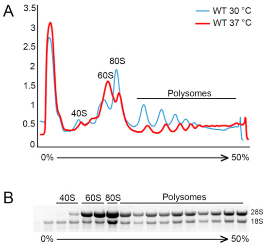 Polysome profiling and analysis. (A) Representative polysome traces for an unstressed C. neoformans culture (30° C) in blue, compared to a polysome profile subjected to temperature stress (37 °C) for 30 min. The decrease in area under both the polysome fraction and 80S monosome peak, along with an increase in the 60S subunit peak, is indicative of repressed translation, reduced initiation, and an increase in the free ribosome pool. (B) RNA following electrophoretic separation from isolated individual fractions from representative polysome profiles. Visible are fractions containing only 18S rRNA representing the small 40S ribosomal subunit, fractions with predominantly 28S rRNA representing the large 60S ribosomal subunits, a fraction containing a strong enrichment of 80S monosomes, and the polysome portion showing distribution of 80S ribosomes.