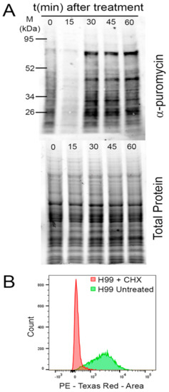 Another key translational inhibitor used in studying translation is puromycin, which is a naturally occurring antibiotic produced by Streptomyces alboniger. The structure of puromycin resembles an aminoacylated tRNA, allowing for its non-template-driven incorporation into the ribosome A site during translation [21]. Once puromycin enters the A site of the ribosome, a peptidyl-puromycin bond is formed, resulting in premature translation termination independent of translational termination machinery, release of the nascent puromycilated peptide, and splitting of the ribosome into its subunits [21,22,23]. These characteristics of puromycin’s action, both the release of a puromycilated nascent chain and the splitting and release of ribosomes, provide us with tools to assess C. neoformans translational activity, further explained below.