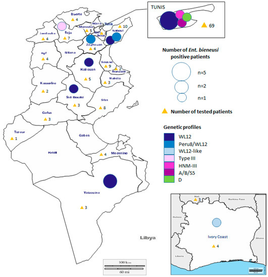 Geographical distribution of the genetic profiles of E. bieneusi infecting intestinal microsporidia-positive patients. The main map shows the different Tunisian districts/cities where E. bieneusi-positive patients (colored spheres) reside. The number of recruited patients originating from each district/city is indicated next to yellow triangles. Sphere sizes are proportional to the number of patients infected with E. bieneusi (n = 1 to 5). The color of the spheres was assigned according to the identified genotypes shown on the legend with a color code, entitled “Genetic profiles”. One patient originating from Ivory Coast (bottom left map) carries E. bieneusi WL12-like genotype.
