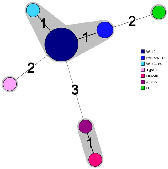 To better visualize the extent of similarity/divergence between the identified genotypes, we constructed a minimum-spanning tree (see Materials and Methods, Figure 2). As expected, genotypes WL12 (n = 10), Peru8/WL12 (n = 2), and WL12-like (n = 1) clustered together, infecting in total 13 patients out of 17 (blue spheres, Figure 2). Genotypes D and Type III formed singletons (pink and green spheres, Figure 2), whereas genotypes HNM-III and A/B/S5 were more distantly related to WL12, forming a cluster that differs by at least three substitutions (brown and purple spheres, Figure 2). Our minimum-spanning tree analysis revealed that the 17 E. bieneusi infection cases were associated with four distinct genotypic clusters and confirms the high prevalence of genotype WL12 in our patient population.